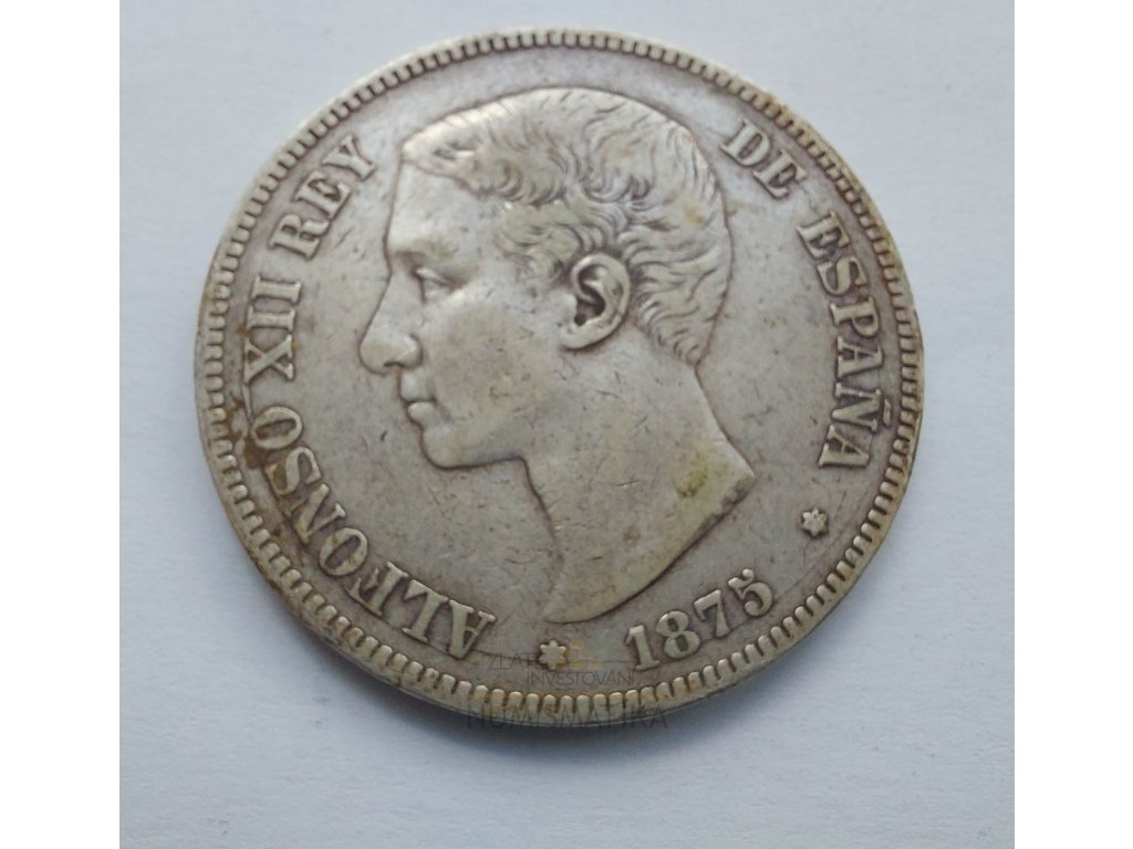 Stříbrná 5 peseta Alfonso XII. -1875-první portrét