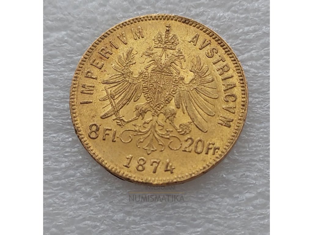 investiční zlato- Osmizlatník-dvaceti frank -8 gulden 1874-rakouská ražba -vzácný ročník
