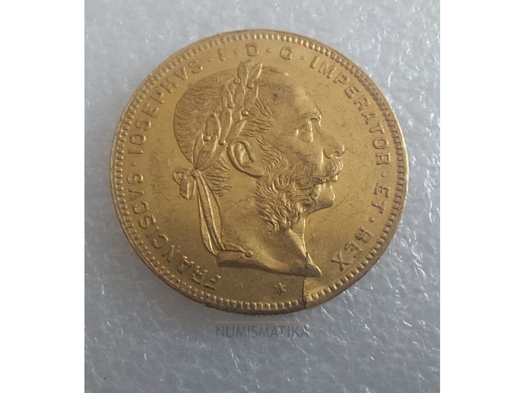 Autory této zlaté mince z vlády císařa Františka Josefa I. jsou Josef Tautenhayn (líc), Anton Scharff (rub). Mince ražena ve vídeňské mincovně v nákladu 41 540 a její celková hmotnost je 6 .45g. Císařský portrér je takzvaná starší podoba.Sběratelsky velmi vyhledávané mince.Jedná se o vzácnější ročník této mince.
