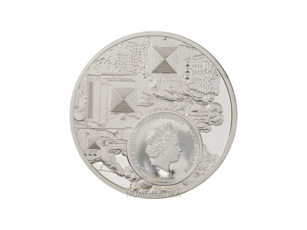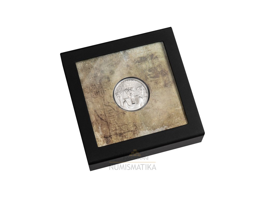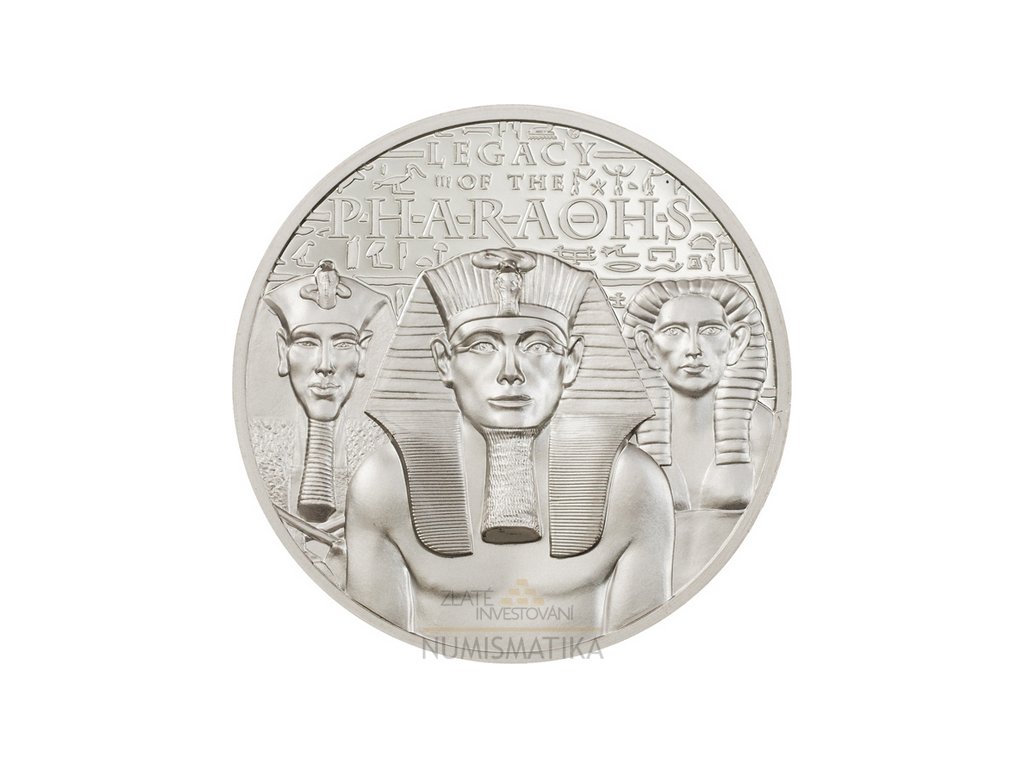 Platinová mince Odkaz faraonů s vyobrazením faraonů na přední straně a na druhé straně mince v minci, Elizabeth II. obklopena pyramidmi.