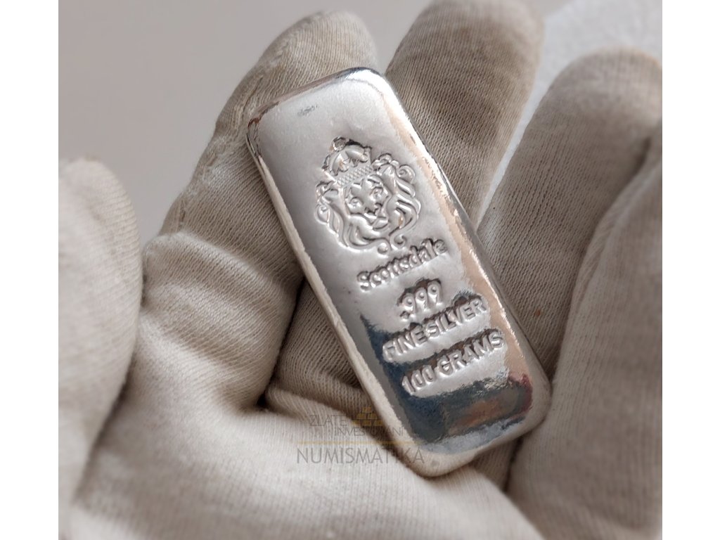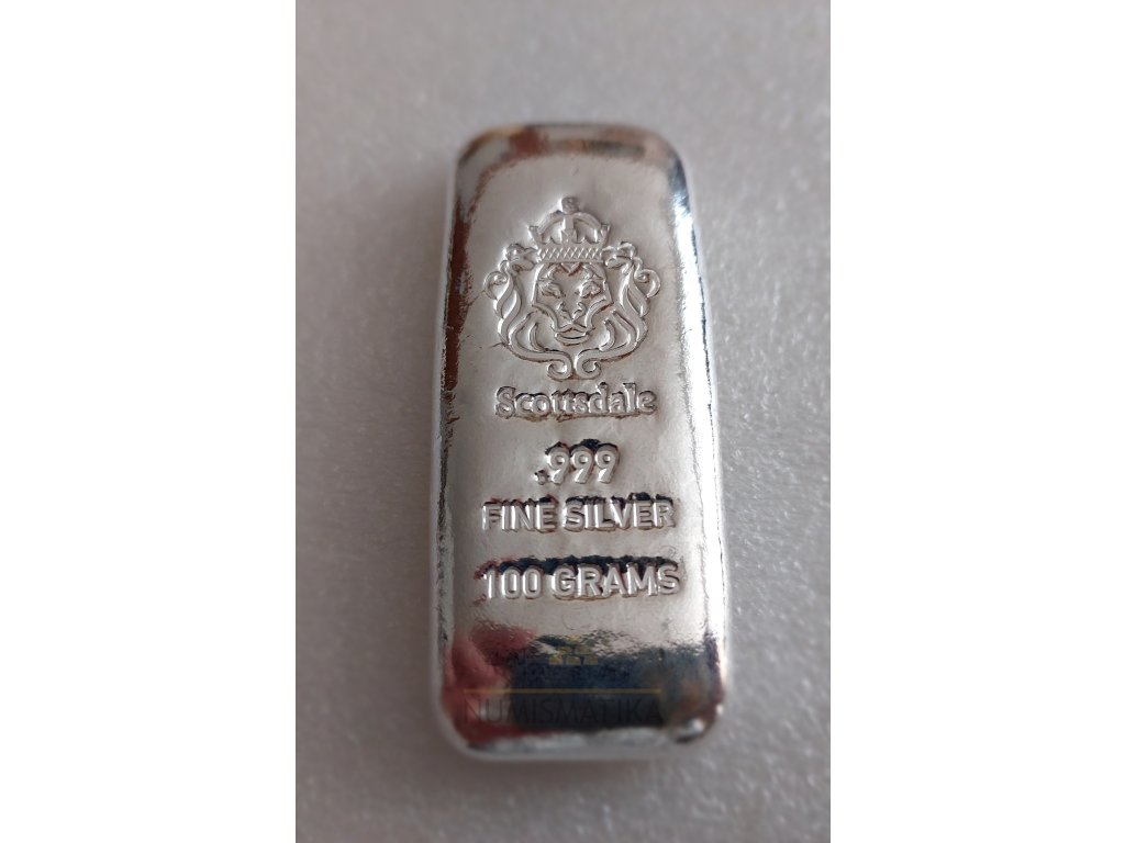 Stříbrná investiční cihla od amerického výrobce Scottsdale mint o váze 100g je dodávána volně bez certifikátu. Vkládáme do plastového obalu.