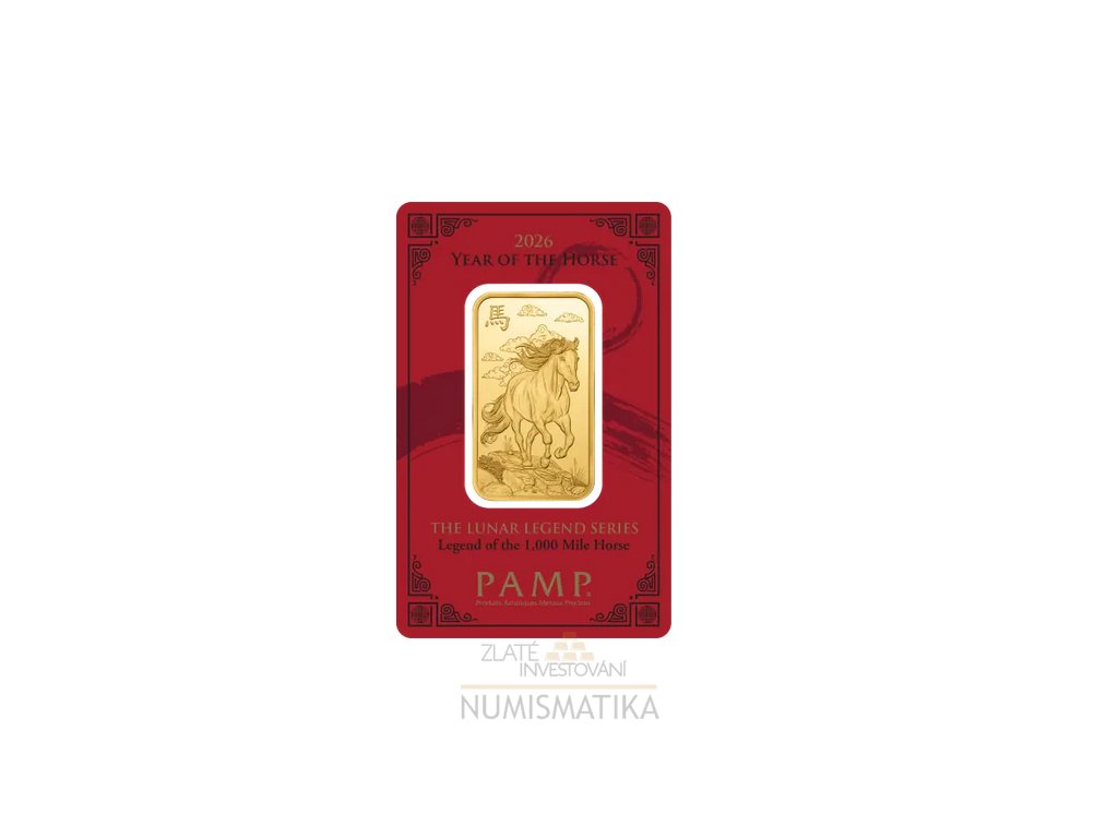 Investiční zlatá cihla s motivem koně pro rok 2026 je dalším skvostem do série lunárních produktů, který vyrábí švýcarská farinérie PAMP. Cihla je opatřena sériovým číslem a je zatavena v bezpečnostním plastovém obalu.