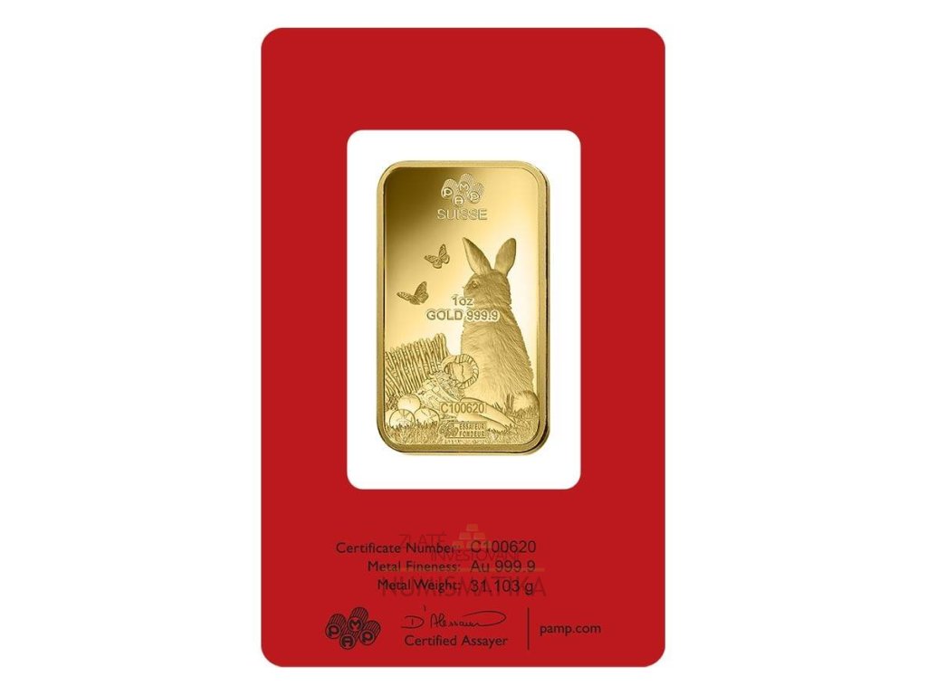 Investiční zlato-zlatá cihla 1 Oz rok králíka 2023-PAMP