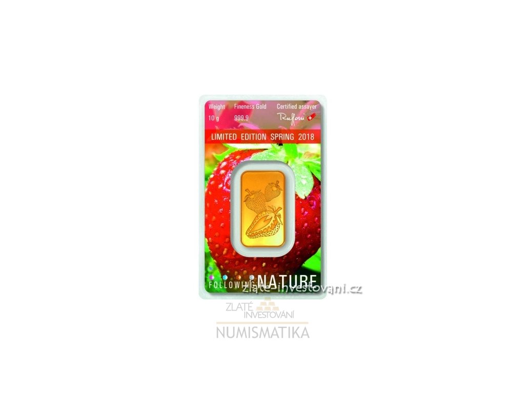 Zlatá investiční cihla o váze 10g od švýcarské mincovny Argor Heraeus je novým produktem v limitované edici. Motivem limitované edice zlatých investičních cihliček je jarní příroda, která je zobrazena jak na rubu slitku, tak na certifikátu v podobě jahod. Cihla je zatavena společně s certifikátem v plastu.