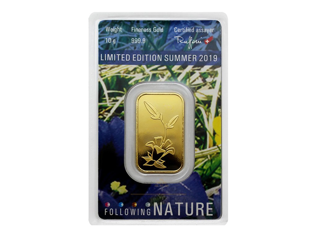 Zlatá investiční cihla o váze 10g od švýcarské mincovny Argor Heraeus je novým produktem v limitované edici. Motivem limitované edice zlatých investičních cihliček je letní příroda, která je zobrazena jak na rubu slitku, tak na certifikátu. Cihla je zatavena společně s certifikátem v plastu.