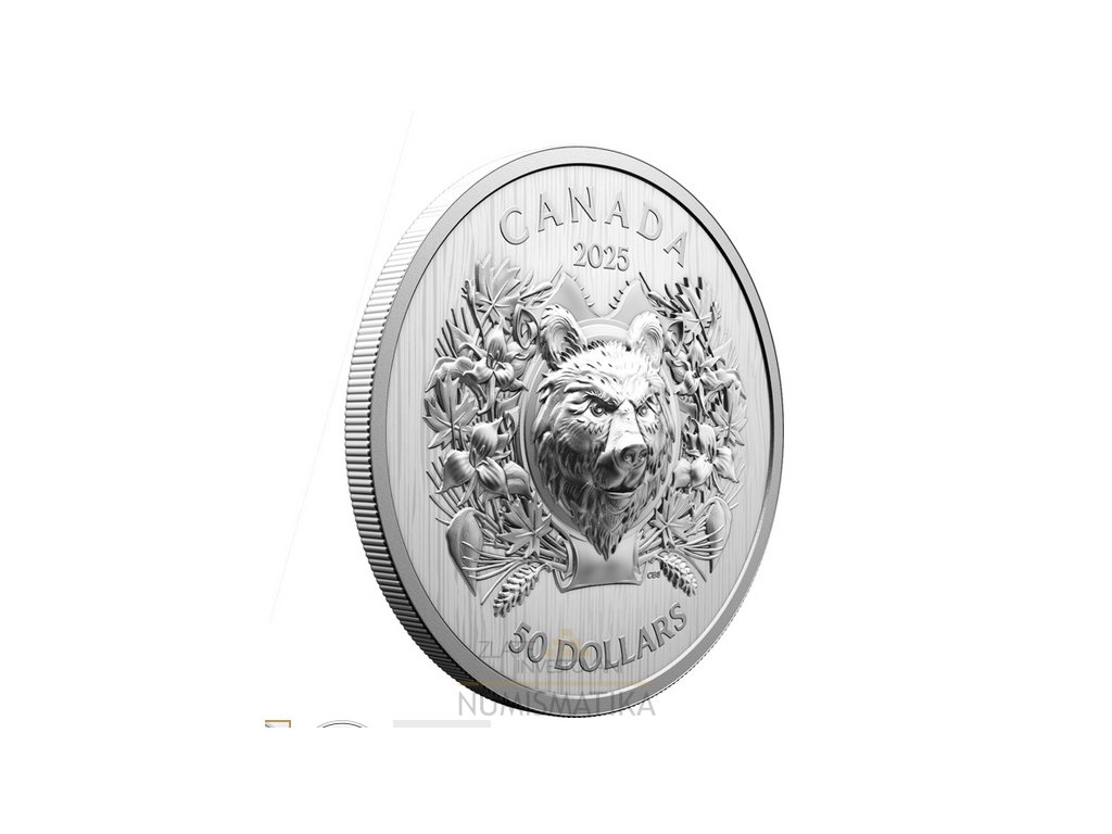 Stříbrná mince 50 CAD-heraldický medvěd 2025-vysoký reliéf