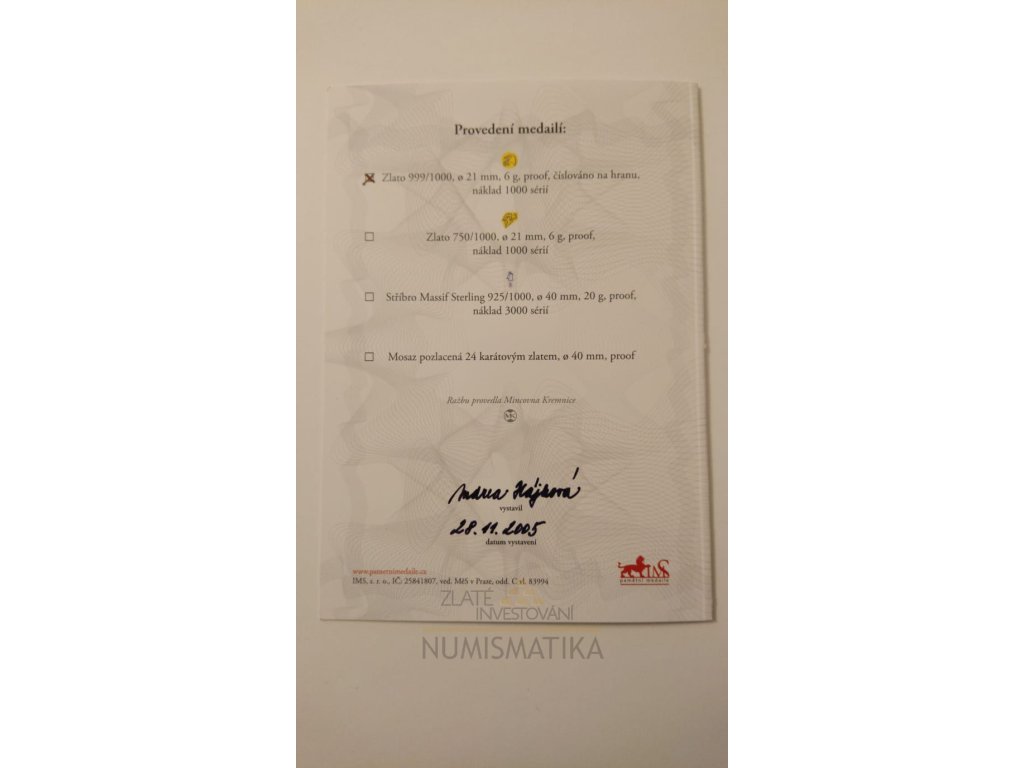 Luxusní set kremnické mincovny obsahuje deset kusů zlatých medailí z investičního zlata ryzosti 999/1000 Au, každá o hmotnosti 6g v provedení proof (vysoký lest). Celkový počet setů je 1000 kusů. Hmotnost ryzího zlata je 60g.