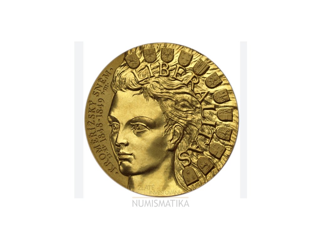 Nádherný zlatý investiční produkt má číslo 023 ze 100 ražených. Motivem je půvabná díky (motiv svobody) a arcibiskupský zámek ve městě Kroměříž, kam byl v revolučním roce 1848 přesunut sněm z Vídně . Dodáváno v dřevěné etuji s certifikátem pravosti České mincovny.