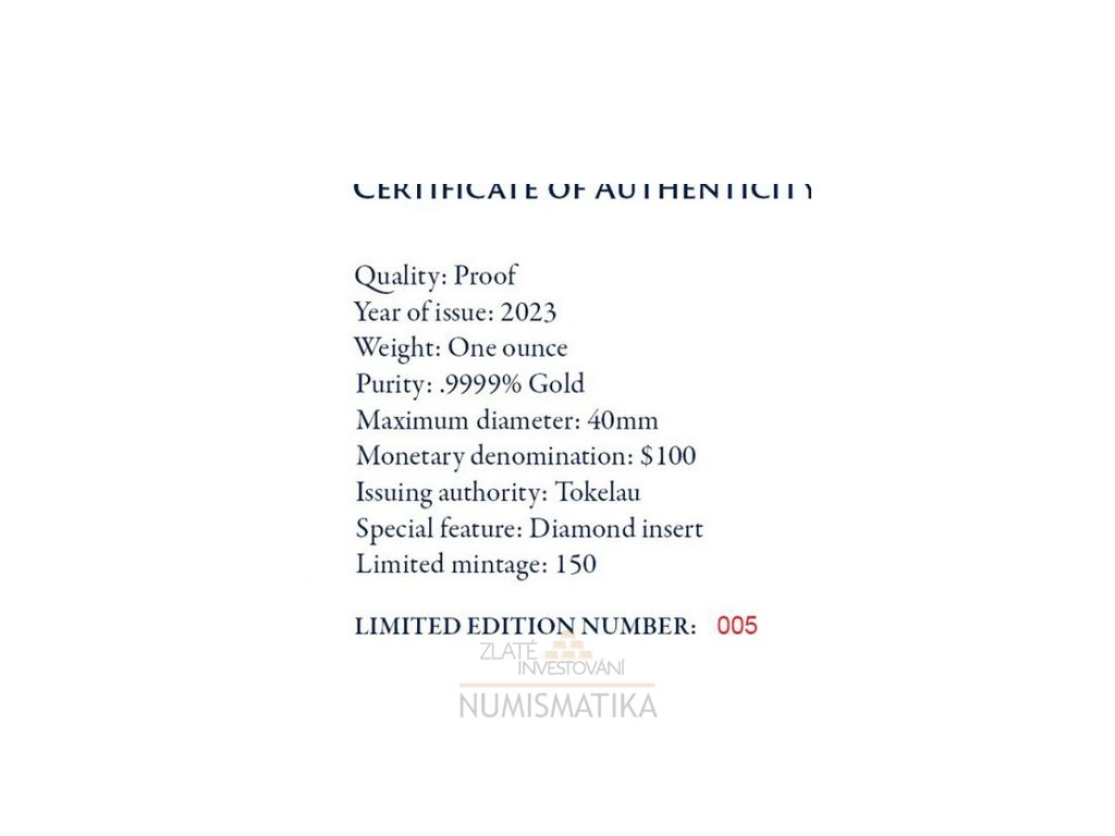 Tato půvabná mince australské mincovny ražena nákladem pouhých 150 kusů. Mince je osazena drobným diatamantem a je dodávána v luxusní etuji s certifikátem pravosti.