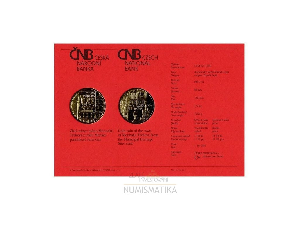 investiční zlato-Zlatá mince 5000 Kč 2024 -Moravská Třebová Proof-1/2 OZ