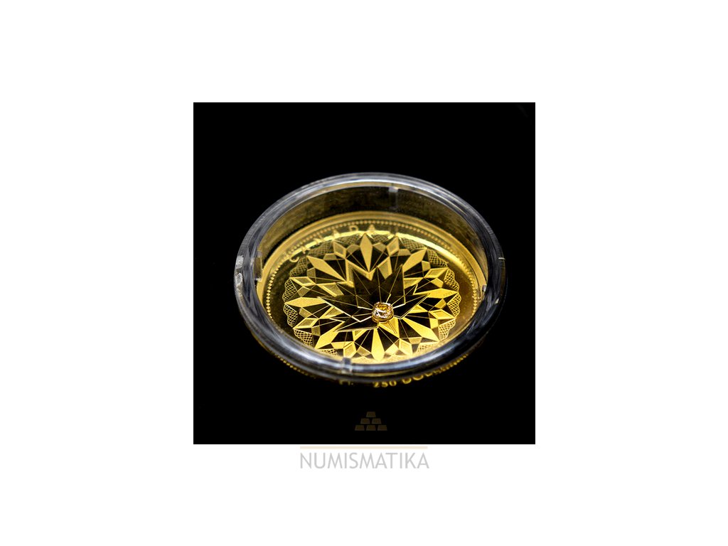 Na přední straně mince je vyobrazena mandala s diamantem ve středu mince a na druhé straně je...