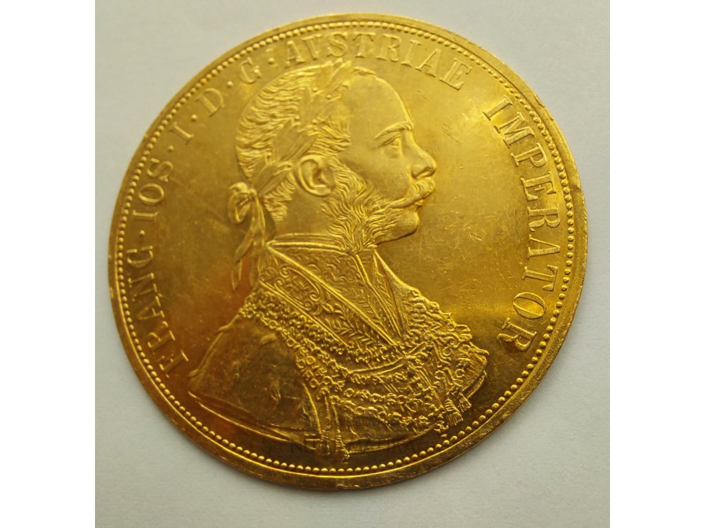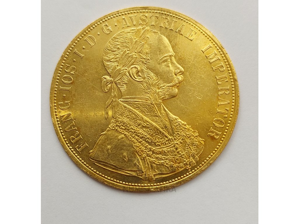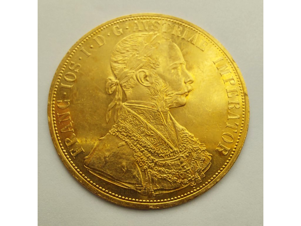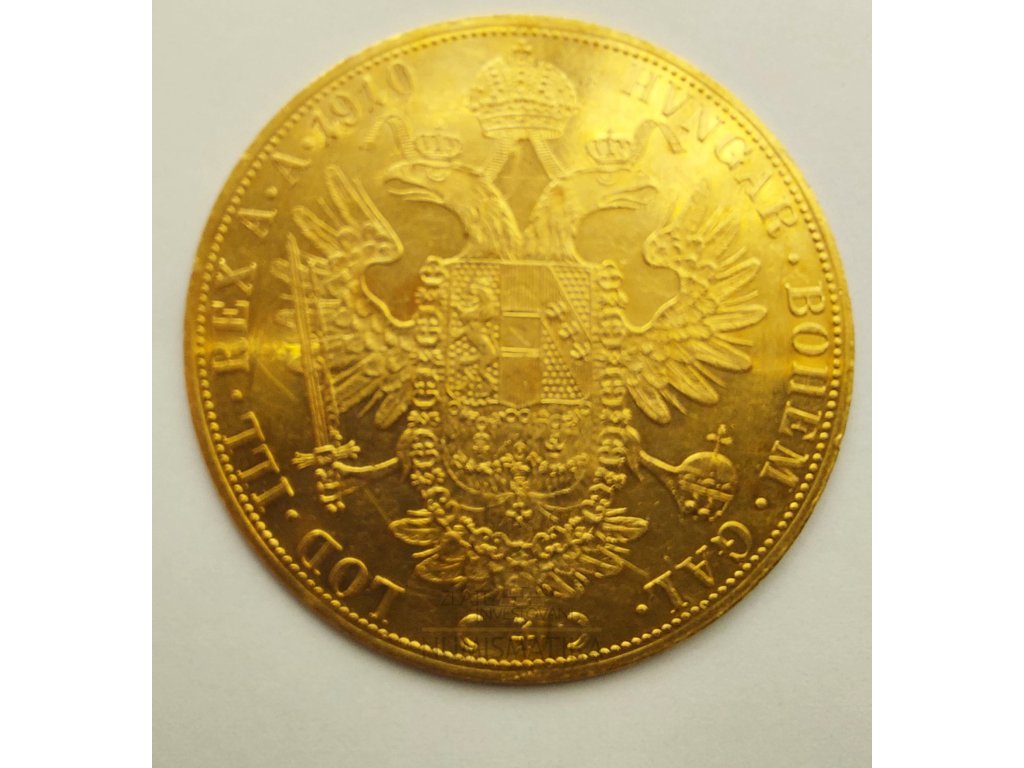 Rakouský čtyřdukát je nesmírně populární sběratelskou a investiční mincí. Čtyřdukáty byly raženy již kolem roku 1830 až do roku 1915 a používány ve většině evropských zem. V současnosti jsou vyhledávány sběrateli a investory, kteří oceňují jejich mistrovské provedení a v čase rostoucí cenu. Různé ročníky těchto mincí se občasně u nás objevují a vždy jde pouze o jednotlivé kusy. Mince mají často tzv. ouško nebo ostruhu na uchycení pro řetízek kolem krku. Ročník 1910 není po oušku a je ve velice dobré kvalitě s místy uchovaným ražebním leskem zejména v reversu. viz. fotky. Tento ročník má náklad pouhých 101 345 kusů.