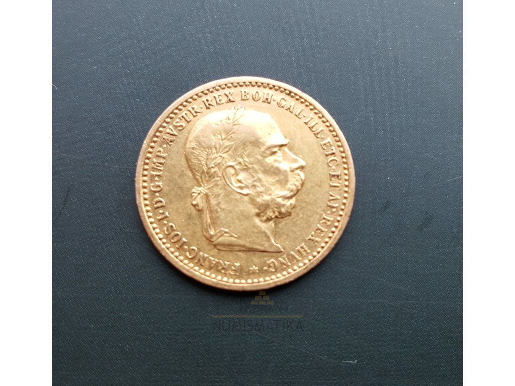 Zlaté desetikoruny byly raženy v letech 1892-1912 ve vídeňské mincovně. Veškeré další nové ražby jsou značeny rokem 1912 a jsou to takzvané novoražby, které jsou mincemi investičními a ne sbírkovými. Hmotnost mince je 3,3875 g a hrana není vroubkovaná, ale s nápisem do hloubky VIRIBVS VNITIS Autoři návrhu mince jsou Anton Scharff (líc) a Rudolf Neuberger (rub). Zlatá desetikoruna byla platidlem od od 1892 a v ČSR přijímána do 22.8.1928. Vzácná mince vyhledávaná sběrateli po ročnících Mince skladem ve velmi pěkném stavu . Celková ražba mince byla 1 933 230 kusů.
